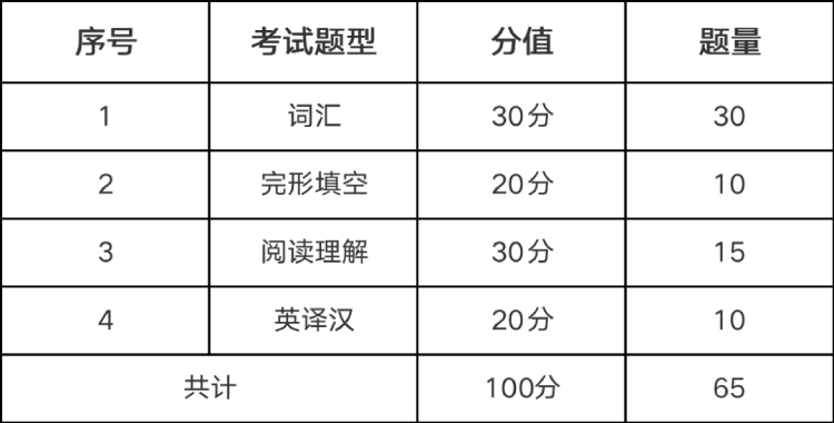 共4個題型:詞匯與結(jié)構(gòu)、完形填空、閱讀理解、英譯漢。