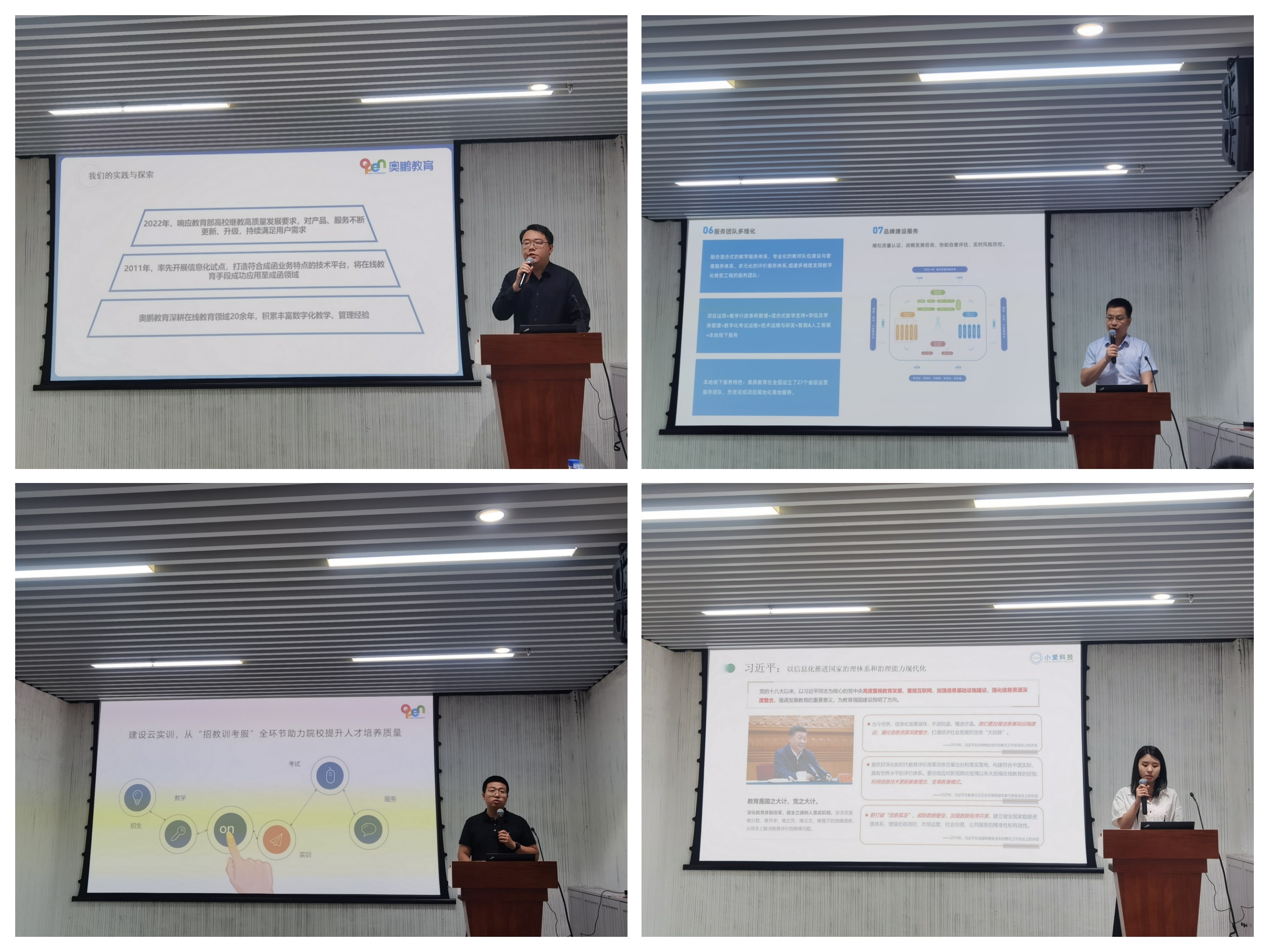 民生教育團(tuán)隊(duì)四位負(fù)責(zé)人從不同側(cè)重分別介紹《奧鵬教育助力高校數(shù)字化轉(zhuǎn)型整體方案》。奧鵬教育繼續(xù)教育發(fā)展中心總監(jiān)李振環(huán)重點(diǎn)介紹了奧鵬教育智慧學(xué)習(xí)云平臺(tái)功能;奧鵬教育繼續(xù)教育發(fā)展中心經(jīng)理方鍵介紹了奧鵬教育數(shù)字化轉(zhuǎn)型支持服務(wù)優(yōu)勢(shì)特色;慕課網(wǎng)副總監(jiān)董曉宇介紹了奧鵬教育云實(shí)訓(xùn)產(chǎn)品;小愛科技產(chǎn)品負(fù)責(zé)人魏麗婷介紹了“校企職通車”的產(chǎn)品特色。奧鵬教育整體方案體現(xiàn)了“高、新、特”,對(duì)高校繼續(xù)教育數(shù)字化轉(zhuǎn)型提供了強(qiáng)有力支持。