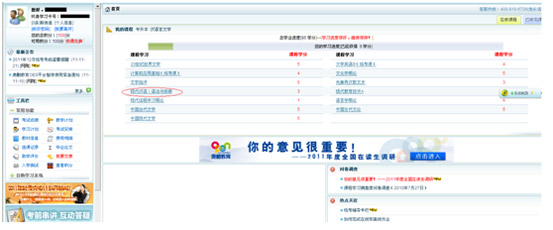 | 步 ? ? ? ? 使用你的用戶名、密碼登錄學生中心首頁。在該頁面的中部“我的課程”專區(qū)下點擊“課程學習”欄目下任何一個課程(以《現(xiàn)代漢語:語法與修辭》為例),進入課程學習,如圖示13-1 |