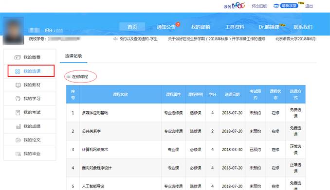 在學(xué)生中心(http://learn.open.com.cn/)首頁(yè)左側(cè)選擇“我的選課”在彈出的頁(yè)面中可以查看到同學(xué)在修課程信息、免修、代修、免考課程信息、修完獲得學(xué)分課程信息、修完未獲得學(xué)分課程信息、教學(xué)計(jì)劃外課程信息等(見(jiàn)下圖):