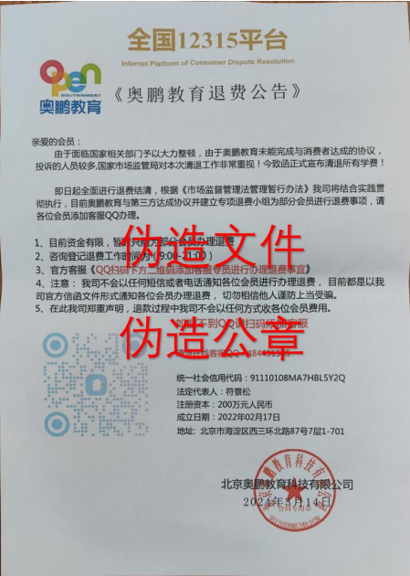 ? ? ? ?近日有不法分子假借北京奧鵬遠(yuǎn)程教育中心有限公司(以下簡(jiǎn)稱(chēng) “奧鵬教育”)、北京奧鵬教育科技有限公司的名義,冒充奧鵬教育工作人員,偽造各類(lèi)文件、公章,散播虛假信息,通過(guò)網(wǎng)絡(luò)平臺(tái)、短信、微信、電話、QQ 群等方式,以幫助學(xué)生辦理清退學(xué)費(fèi)的名義,讓學(xué)生加入QQ群,騙取學(xué)生個(gè)人信息和錢(qián)財(cái),實(shí)施詐騙。